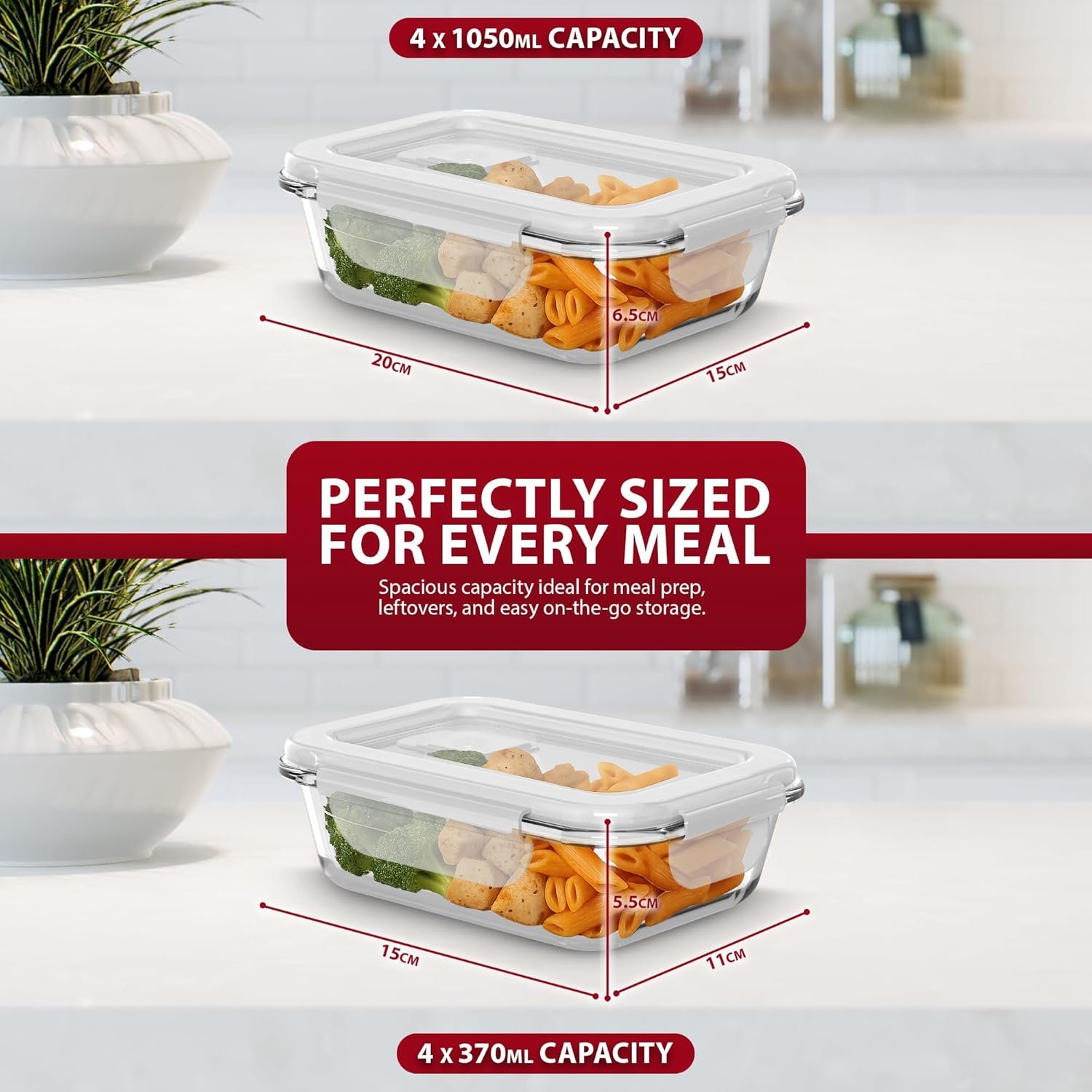 • PERFECT VARIETY OF SIZES FOR ANY MEAL – This 8 pack includes four 1050ml and four 370ml glass food containers with lids, giving you the flexibility to store large portions, small snacks, sauces, or leftovers with ease. Whether meal prepping or packing lunches, you’ll always have the right size ready.