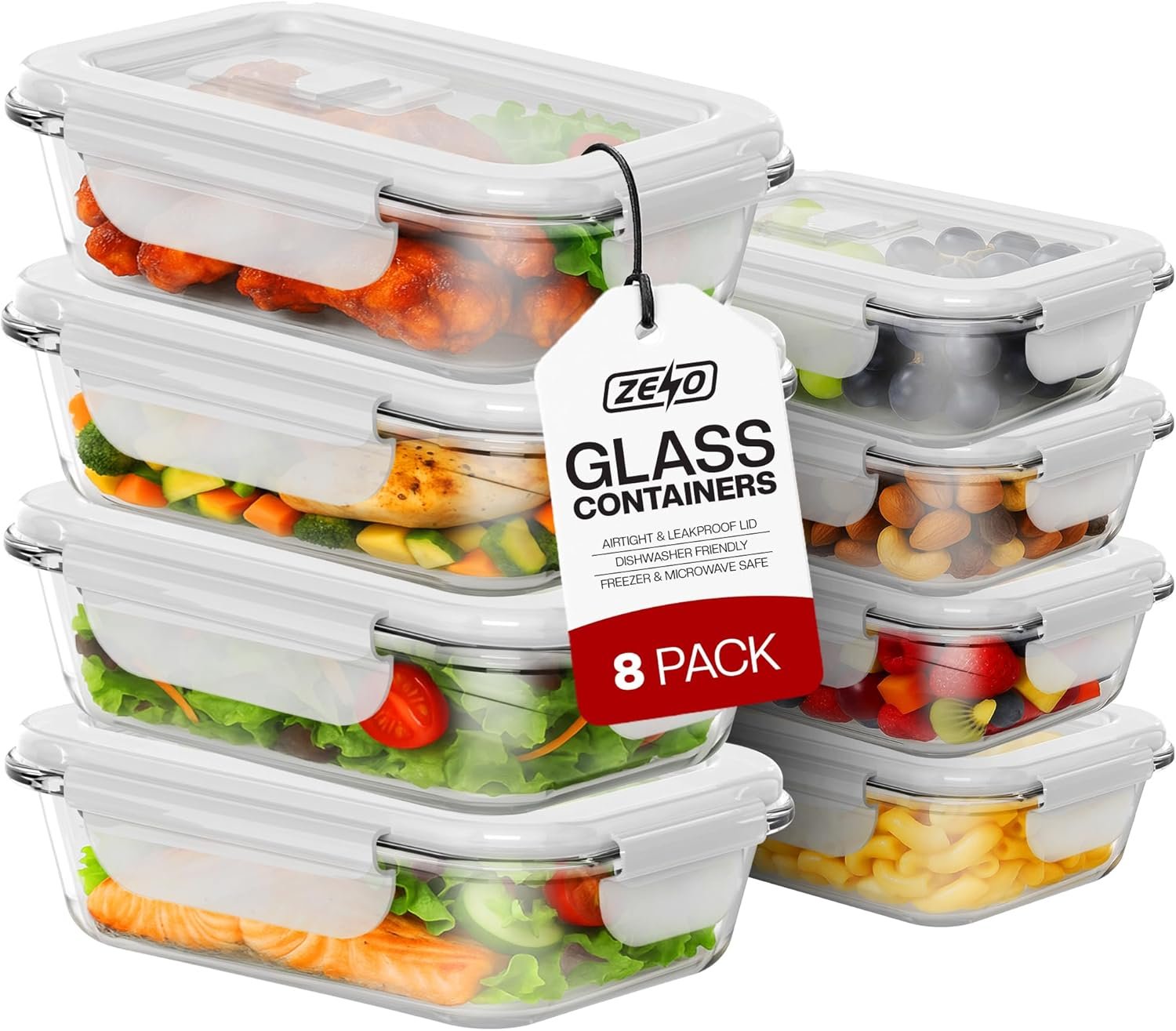 ZENO Glass Containers with Lids 8 Pack | Meal Prep Containers | Glass Food Container with Lid, Airtight Seal, Leakproof Lid | Dishwasher Safe | Freezer & Microwave Safe | 4 X 1050ml + 4 X 370ml
